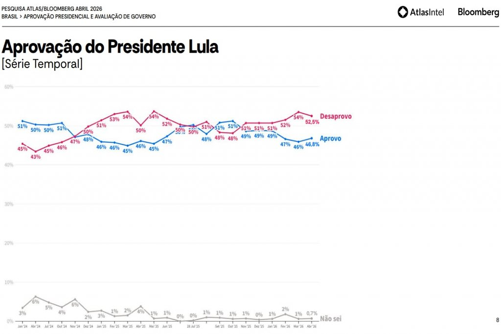 Brancos, nulos e indecisos somaram 0,2%. Foram ouvidas 5.008 pessoas, por meio de recrutamento digital aleatório (Atlas RDR), entre os dias 22 e 27 de abril. A margem de erro é de um ponto percentual, para mais ou para menos, com nível de confiança de 95%.
